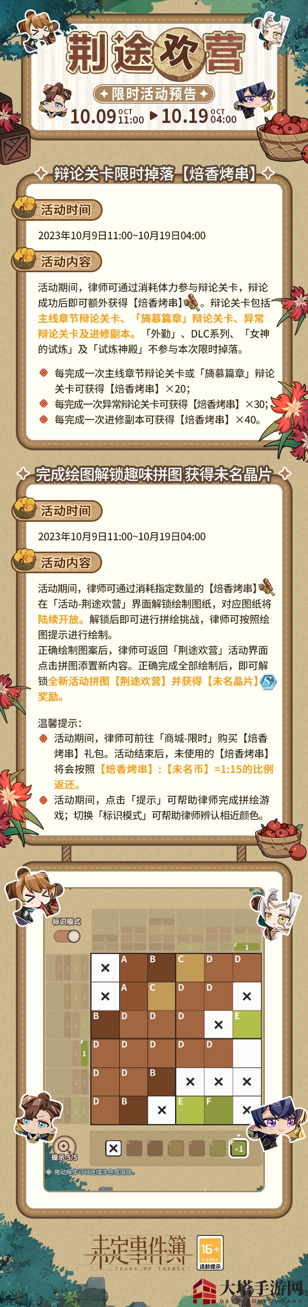 活动期间,玩家需消耗指定数量的【焙香烤串】在「活动-荆途欢营」界面解锁绘图,对应图纸将逐步开放。解锁后,即可挑战拼绘,按照绘图提示进行绘制。