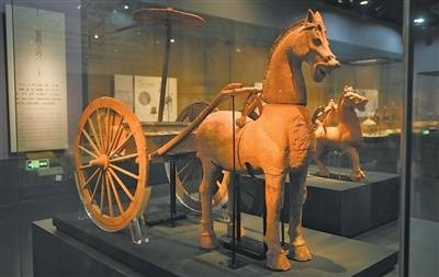 走进博物馆二楼展(zhan)厅,陶轺(diao)车(che)一米(mi)多高(gao),引人注视。车(che)前,骏(jun)马表情(qing)松弛天然,还略带笑意。向后(hou)看,马匹肌肉发(fa)达,骨骼健(jian)硕,通过(guo)一驾车(che)轴与马身(shen)后(hou)的木质敞篷车(che)相连。细致看,陶轺(diao)车(che)为木质车(che)轮,车(che)舆(yu)局促,仅(jin)能容纳一至两人站立。车(che)体(ti)上方(fang),伞(san)盖较小,整体(ti)车(che)型雷(lei)同于古代敞篷车(che)。