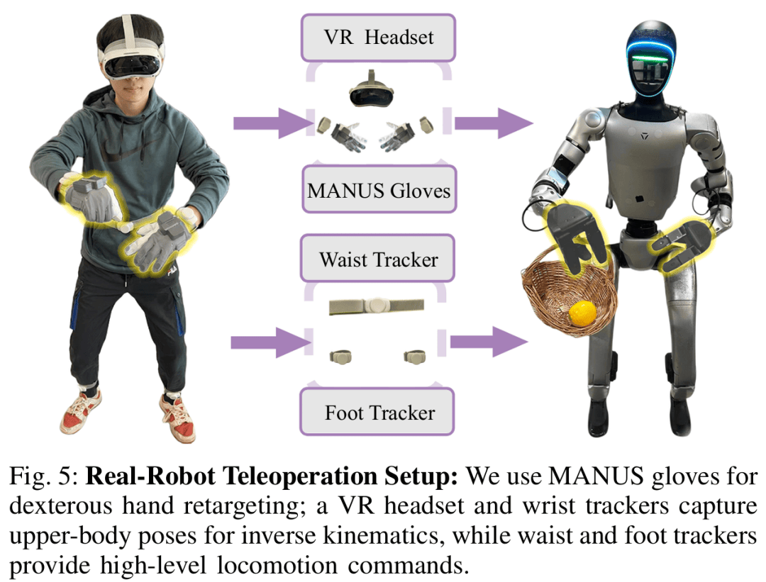 为高效采集高质量人形(xing)机器人数(shu)据,设计单人即可完成的(de)全身远程操(cao)作(zuo)方案(如图 5):