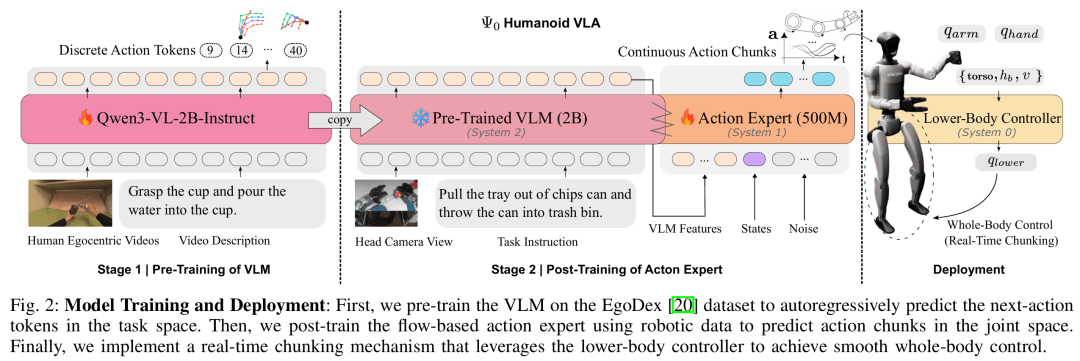 解耦学习:先用人类视频学通用视觉-动作(zuo)先验,再用机器人数(shu)据学精准关节空间控制;