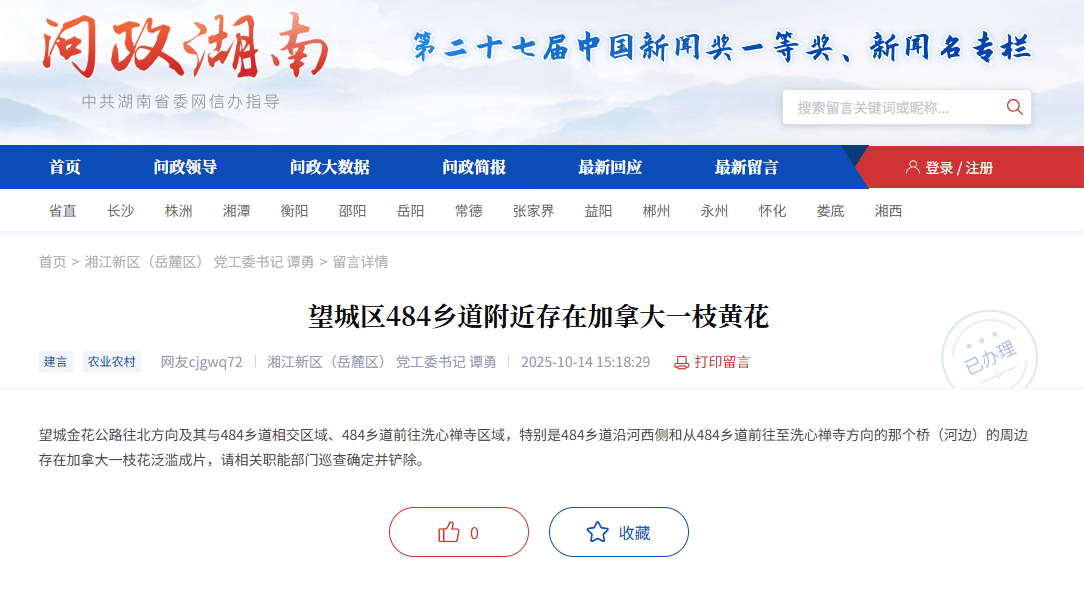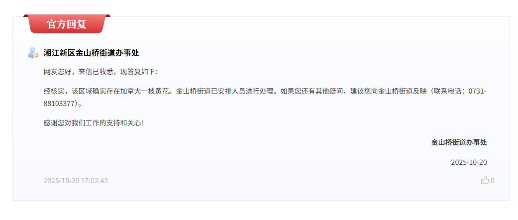 红网时候新闻(wen)10月21日讯(xun)(记者 陈星晓(xiao))近日,有网友在红网《问政(zheng)湖南》平(ping)台反映,长沙市望城区(qu)金(jin)花公路北段及484乡(xiang)道周边、洗心禅寺方向河(he)道区(qu)域存在“加拿大一枝(zhi)黄花”集中蔓延的情况。该问题后续得到湘江新区(qu)金(jin)山桥街道办事处(chu)响应,经现场核实后,该街道办事处(chu)已安排职(zhi)员举行处(chu)理。