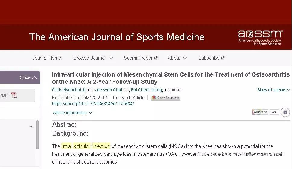 2017年7月,《美国运动医学杂志》(《The American Journal of Sports Medicine》)刊发了一篇题为《关节内注射间充质干细胞治疗膝关节骨性关节炎:一项为期两年的随访研究》。结果表明:在2年时间内,关节腔注射自体脂肪间充质干细胞治疗膝关节炎安全、有效。