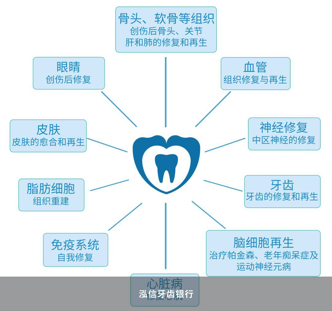 据科学研究表明:儿童的乳牙中含有十分丰富的牙髓干细胞,这些牙髓干细胞可定向分化为成骨细胞、神经细胞、心肌细胞以及肝细胞等多种人体细胞,牙髓干细胞分化和再生能力是其他来源干细胞的三倍,可以用于修复组织和器官病变、损伤。牙髓干细胞免疫原性低,不容易引起排异反应,一个家庭只需一个家庭成员进行牙髓干细胞储存,就可以用于整个家庭的口腔疾病及其他相关疾病的干预治疗,故医用潜在价值极大。