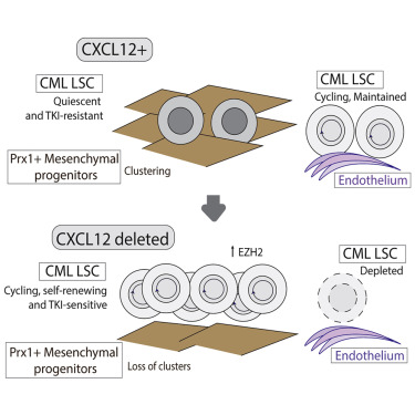 CXCL12在骨髓中表达,控制造血干细胞的维持。已知骨髓中有四种细胞大量产生CXCL12。在小鼠实验中,Bhatia和他的同事使分别每种细胞产生CXCL12的基因缺失,然后研究每种缺失如何影响白血病干细胞的调控。他们发现,从间充质基质细胞中删除CXCL12,而不从其他三种表达CXCL12的骨髓微环境细胞类型中删除CXCL12,会促进白血病的发展,降低小鼠的存活率。这些结果与慢性骨髓性白血病干细胞的细胞周期增加和扩增有关。然而,循环白血病干细胞对酪氨酸激酶治疗变得敏感,导致它们的消除增加。